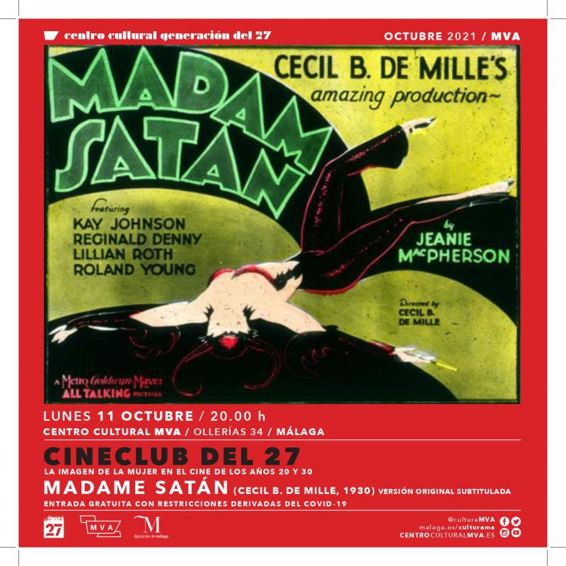 El Cineclub del 27 encara el último trimestre del año con la proyección de uno de los títulos característicos del Hollywood anterior al Código Hays. Se trata de de ‘Madame Satán’, de Cecil B. De Mille, una comedia que gira en torno al adulterio. Se este modo, el ciclo cinematográfico del Centro del 27 continúa repasando el papel de la mujer en el cine de los años 20 y 30 como viene haciendo desde hace varias temporadas con títulos como ‘Juana de Arco’, ‘El viento’, ‘Anna Christie’, ‘La muchacha de Londres’, Cleopatra’, ‘Bajo los techos de París’, ‘Ha nacido una estrella’, ‘Los pantanos de Zanzíbar’, ‘El jardín de Alá’, ‘La viuda alegre’, ‘Sangre rebelde’ y ‘Muchachas de uniforme’.