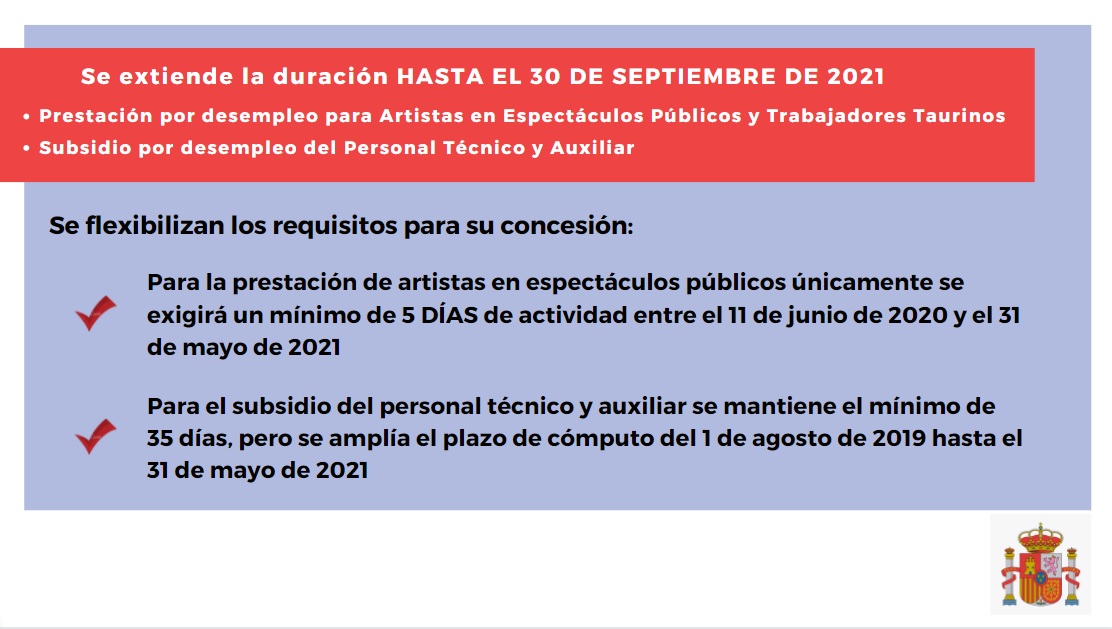 Se extiende la duración de la prestación por desempleo de artistas en espectáculos públicos y trabajadores taurinos y el subsidio del personal técnico y auxiliar hasta el 30 de septiembre de 2021.