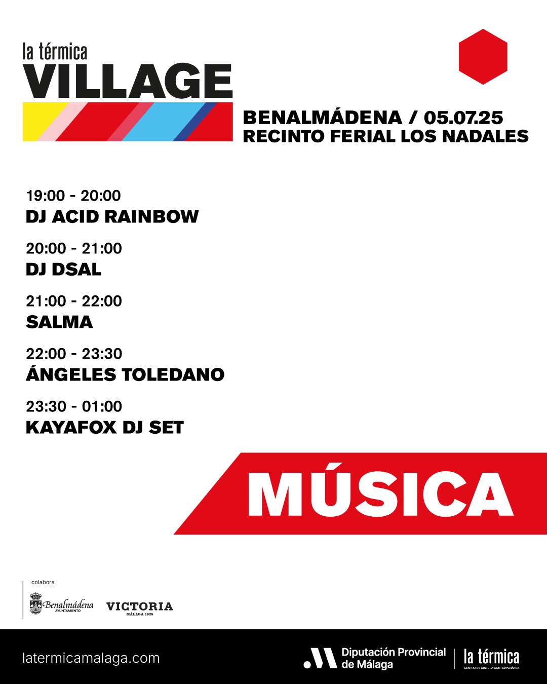La segunda cita del año de La Térmica Village, uno de los proyectos más ambiciosos del centro de cultura contemporánea de la Diputación Provincial, desembarca en el municipio de Benalmádena el sábado 5 de julio con el emocionante viaje flamenco de Ángeles Toledano. La joven cantaora, prometedora voz del arte jondo más actual y contemporáneo, presentará su disco debut, ‘Sangre sucia’. Junto a ella llega la malagueña Salma con su primer álbum, ‘Sangre de cobarde’, y los dj sets de KayaFox, Dsal y Acid Rainbow llenarán de música la velada en el Recinto Ferial Los Nadales. Desde las 19:00 hasta la 1:00 horas, el evento gratuito ofrecerá talleres, mercado de diseño, pintura en directo, actividades para toda la familia y gastronomía.
