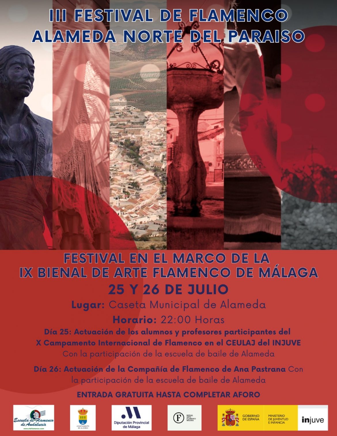 El municipio de Alameda acogerá los días 25 y 26 de julio la tercera edición del Festival de Flamenco Alameda Norte del Paraíso que contará con la presencia de jóvenes talentos de la Escuela de Flamenco de Andalucía (EFA), y de los alumnos y profesores del X Campamento Internacional de Flamenco y Danza Española, que se celebrará en el CEULAJ de Mollina, con la colaboración de la Diputación Provincial de Málaga.