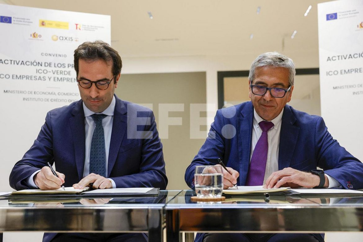 El ministro de Economía, Comercio y Empresa, Carlos Cuerpo, y el presidente del Instituto de Crédito Oficial (ICO), José Carlos García de Quevedo, han suscrito el convenio que regula las condiciones de las líneas «ICO Verde» e «ICO Empresas y Emprendedores» y activa el despliegue los 30.150 millones de euros en préstamos del Plan de Recuperación con los que están dotadas
