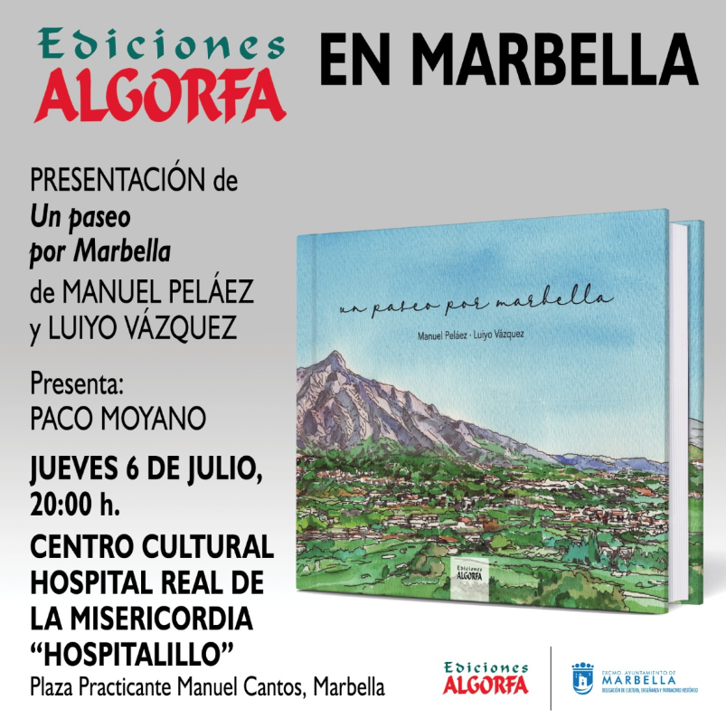 El Hospital Real de la Misericordia albergará este jueves, a las 20.00 horas, la presentación del libro ‘Paseando por la ciudad de Marbella’, una obra de Manuel Peláez y Luiyo Vázquez. En la publicación, los autores logran una precisa combinación y complemento entre la imagen y la palabra para que, con una continuidad natural, el poeta se sienta estimulado por el dibujo del arquitecto y ambos por lo que les dice el paisaje urbano de la ciudad.