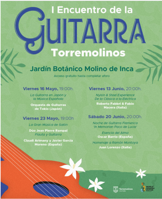 El I Encuentro de Guitarras en Torremolinos se celebrará en el Jardín Botánico Molino de Inca del 16 de mayo al 20 de junio. Contará con diversas modalidades teniendo siempre a la guitarra como principal protagonista, y ofreciendo al público una experiencia única en un entorno inigualable. El evento ha sido presentado por el concejal de Cultura, José Manuel Ruiz, y el presidente de la World Spanish Guitar Foundation, Javier García Moreno.