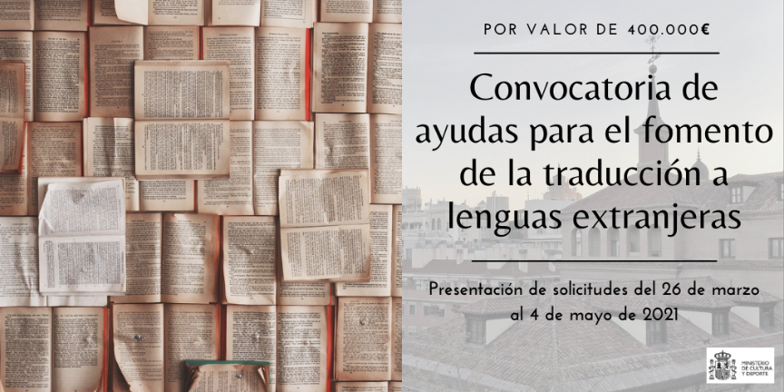El Boletín Oficial del Estado ha publicado la convocatoria realizada por el Ministerio de Cultura y Deporte de subvenciones para el fomento de la traducción a lenguas extranjeras correspondiente a 2021 por un valor de 400.000 euros. El plazo de presentación de solicitudes está abierto hasta el 4 de mayo de 2021.