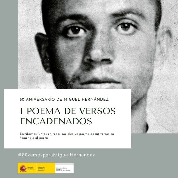 Hoy lunes 28 de marzo, con motivo del 80 aniversario del fallecimiento del poeta y dramaturgo Miguel Hernández, el Ministerio de Cultura y Deporte, a través de la Dirección General del Libro y Fomento de la Lectura, llevará a cabo la acción literaria participativa en redes sociales I Poema encadenado ’80 versos para Miguel Hernández’.