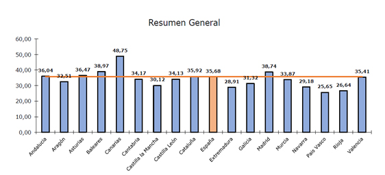 Los territorios que registraron una tasa inferior a la nacional fueron País Vasco (25,65), La Rioja (26,64), Extremadura (28,91), Navarra (29,18), Castilla-La Mancha (30,12), Galicia (31,32), Aragón (32,51), Murcia (33,87), Castilla y León (34,13), Cantabria (34,17) y Comunidad Valenciana (35,41).