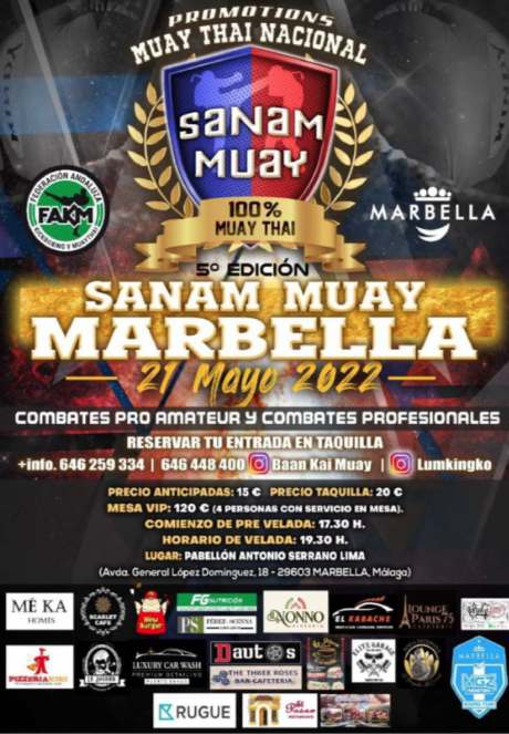 El Pabellón Antonio Serrano Lima será escenario este sábado, día 21 de mayo, de la quinta edición del ‘Sanan Muhay Marbella’. El evento comenzará a las 17.30 horas con un gran número de atletas neo-profesionales y amateur y dará paso posteriormente, a las 19.30 horas, a una velada donde se ofrecerán los mejores combates profesionales del campeonato de Muaythai. El concejal de Deportes, Manuel Cardeña, ha asistido a la presentación de la cita, en el Gimnasio Baan Kai Muay, y ha resaltado que “se trata de un deporte que cuenta con mucha afición en nuestro municipio y que cada vez atrae a más adeptos”. Además, ha indicado que “este tipo de veladas ayuda también a quitar alguna etiqueta de violencia, ya que se trata de una disciplina en la que el respeto está muy presente entre todos los participantes”. “Vamos a continuar apostando por este deporte y por personas como el instructor Pedro Antonio Carrasco, vecino de Marbella, que ayudan a su impulso y promoción”, ha añadido.