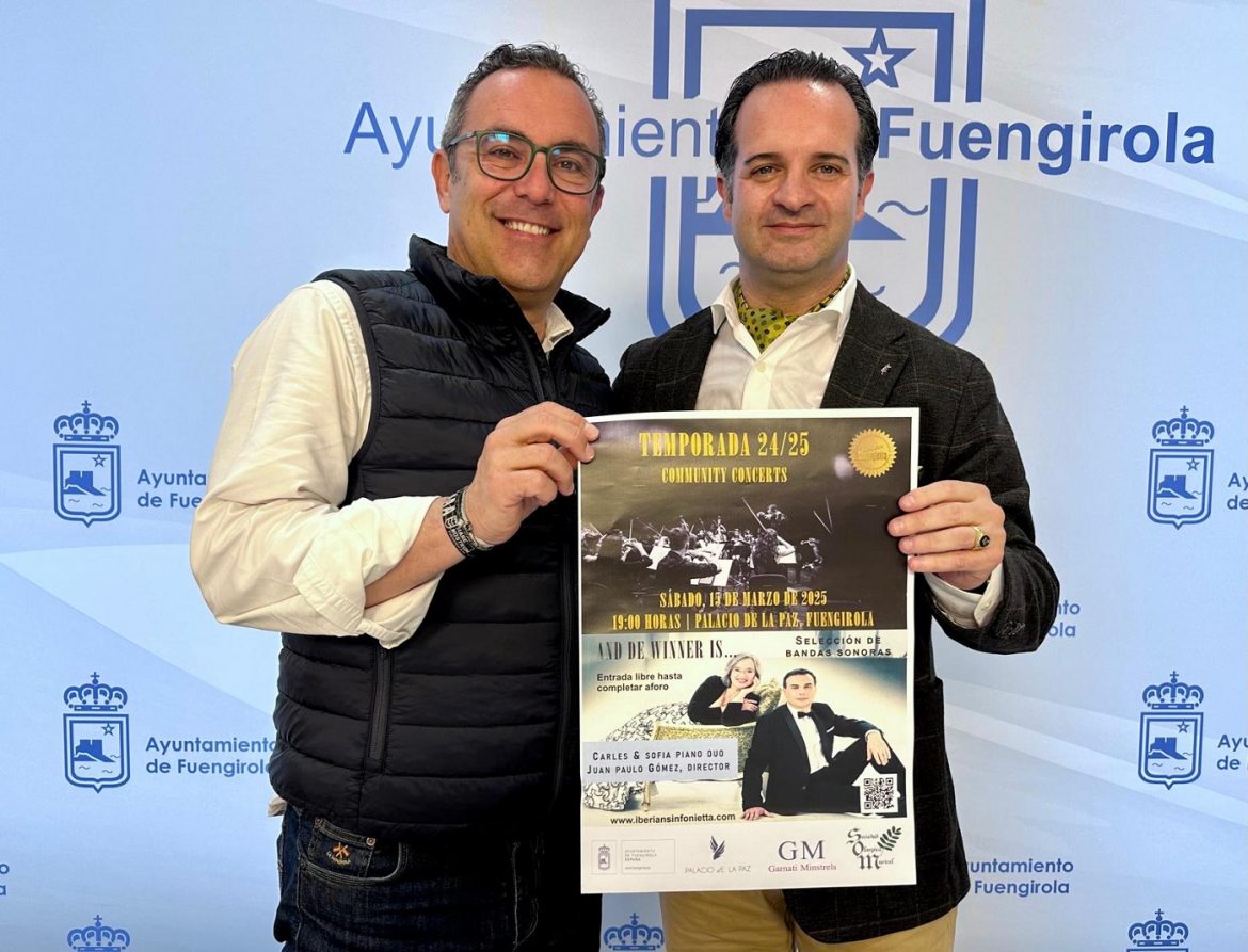 El Palacio de la Paz de Fuengirola acoge el sábado 15 de marzo un nuevo concierto gratuito de Iberian Sinfonietta, que en esta ocasión se denomina ‘And the winner is…’ y que está dedicado a bandas sonoras de películas y series de televisión. Dará comienzo a las 19:00 horas y contará con la participación de los artistas Carles & Sofía Piano Dúo. El concejal de Cultura, Rodrigo Romero, y el director de la orquesta, Juan Paulo Gómez, han sido los encargados de presentar este nuevo recital del ciclo de Community Concerts.