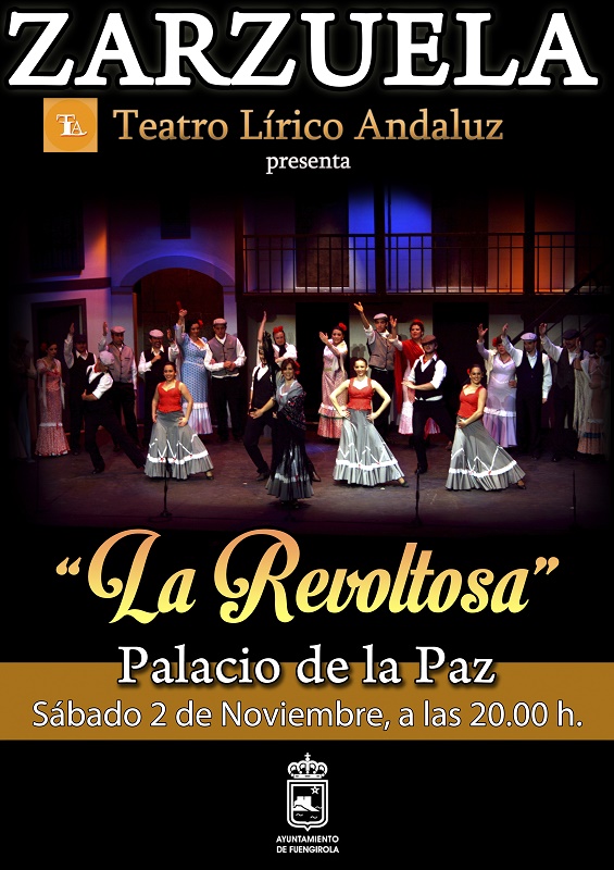 La zarzuela regresará al Palacio de la Paz el sábado 2 de noviembre, a partir de las 20:00 horas, de la mano de la compañía Teatro Lírico Andaluz, que representará la obra ‘La Revoltosa’. Las entradas para la función tienen un precio de 10 euros el patio de butacas y de 15 euros los palcos y se pueden adquirir en la web https://entradas.fuengirola.es o en la taquilla del Palacio de la Paz desde dos horas antes del comienzo de la función.