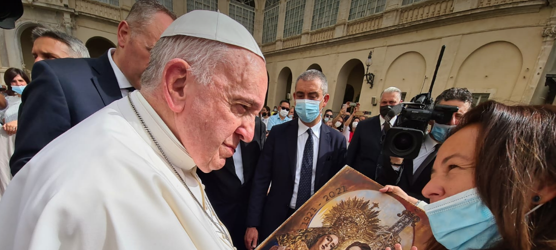 Con motivo de una visita privada para la organización y divulgación del Congreso Internacional que se celebrará en septiembre en Málaga, Paloma Saborido ha entregado al Sumo Pontífice una serie de obsequios del Centenario de la Agrupación