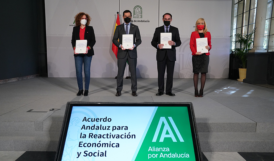 El presidente de la Junta de Andalucía, Juanma Moreno, ha firmado este lunes junto al presidente de la Confederación de Empresarios de Andalucía (CEA), Javier González de Lara; a la secretaria General de UGT Andalucía, Carmen Castilla, y la secretaria general de CCOO Andalucía, Nuria López, el Acuerdo de Medidas Extraordinarias en el marco de la Reactivación Económica y Social de Andalucía que supone una nueva inyección al tejido productivo andaluz, en ayudas directas, por valor de 732,44 millones de euros.