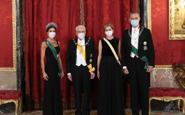 Por la noche, en el Palacio Real de Madrid, Sus Majestades los Reyes ofrecieron una cena de gala en honor de Sus Excelencias el Presidente del a República Italiana, Sergio Mattarella, y señora Laura Mattarella. Los Reyes recibieron, en el Salón de Teniers, al presidente de la República Italiana, y a la señora Laura Mattarella.