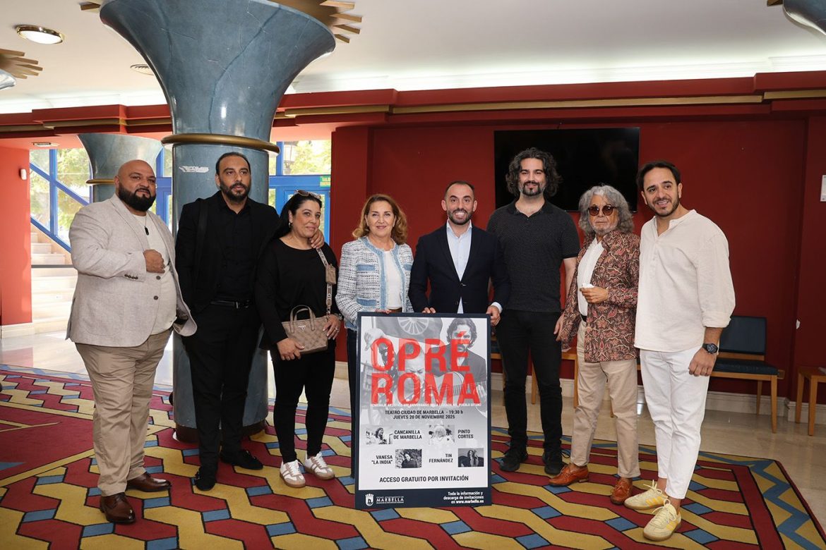 El teatro Ciudad de Marbella albergará el jueves 20 de noviembre ‘Opré Roma’, un espectáculo con el que el Ayuntamiento continúa rindiendo homenaje al pueblo gitano con motivo del 600 aniversario de su llegada a la península. El concejal de Participación Ciudadana, Enrique Rodríguez, ha presentado hoy el evento junto a la edil de Derechos Sociales, Isabel Cintado, y los artistas Manuel Cortés ‘El Pinto’, Tin Fernández, Vanesa ‘La India’, Ángel Cortés y el organizador Miguel Ortiz ‘El Nene’, y ha subrayado que “es una muestra del reconocimiento de Marbella al legado cultural, social y artístico de esta comunidad con una propuesta que, en lengua romaní, significa ‘Arriba pueblo gitano’ y que va a reunir a figuras referentes del flamenco”. Asimismo, ha indicado que “no se puede comprender el patrimonio cultural español sin su aportación, especialmente a través de un género que es una de nuestras señas de identidad más internacionales”.