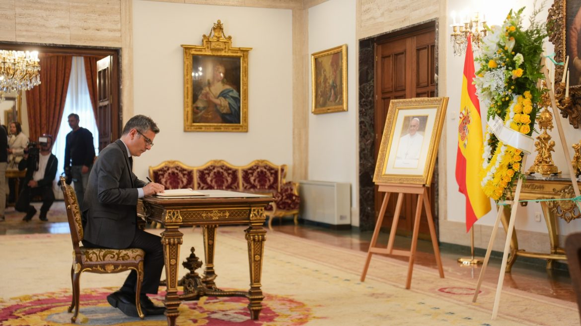 El ministro de la Presidencia, Justicia y Relaciones con las Cortes, Félix Bolaños, ha firmado este martes el libro de condolencias por el fallecimiento del papa Francisco abierto en la Nunciatura Apostólica en España, sede de la embajada del Vaticano.