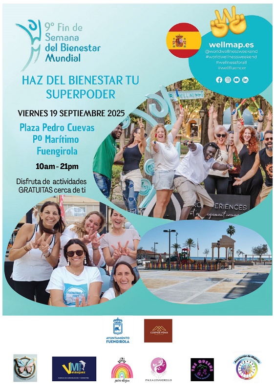 Fuengirola acogerá el próximo 19 de septiembre una nueva edición del Fin de Semana del Bienestar Mundial, que se celebrará en la plaza Pedro Cuevas de 10:00 a 21:00 horas. La jornada reunirá a profesionales del sector de la salud y el bienestar de la ciudad, con un completo programa de actividades gratuitas que incluye zumba, clases de baile, danza del vientre, masajes, lectura de cuentos infantiles, entre muchas otras propuestas. La iniciativa forma parte del programa municipal ‘Fuengirola en Forma’ y se enmarca en el World Wellness Weekend, un evento internacional que promueve el bienestar integral y que se desarrolla simultáneamente en más de 150 países.