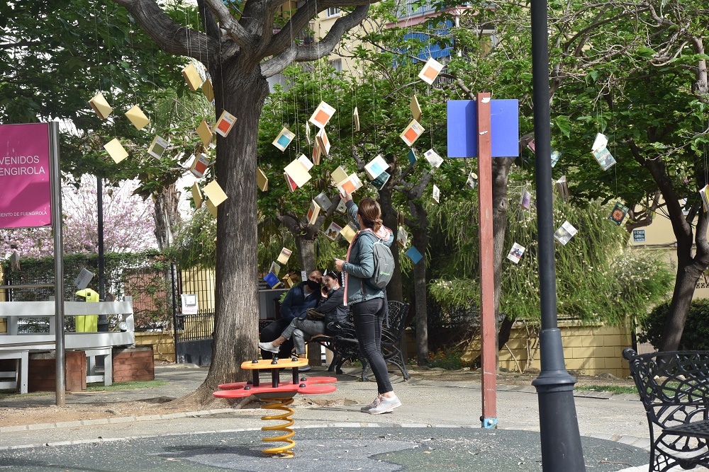 El parque del Sol de Fuengirola acoge desde hoy y hasta el 2 de mayo la exposición “Frutos Literarios” dentro de la Semana del Libro. El concejal de Cultura del Ayuntamiento de Fuengirola, Rodrigo Romero, ha asistido esta mañana a la apertura de esta muestra, donde los libros cuelgan de los árboles como frutos que se pueden coger y llevar a casa. Además de esta exposición, mañana, con motivo de la celebración del Día del Libro, se llevará a cabo una maratón de lectura y diferentes cuentacuentos en las bibliotecas.