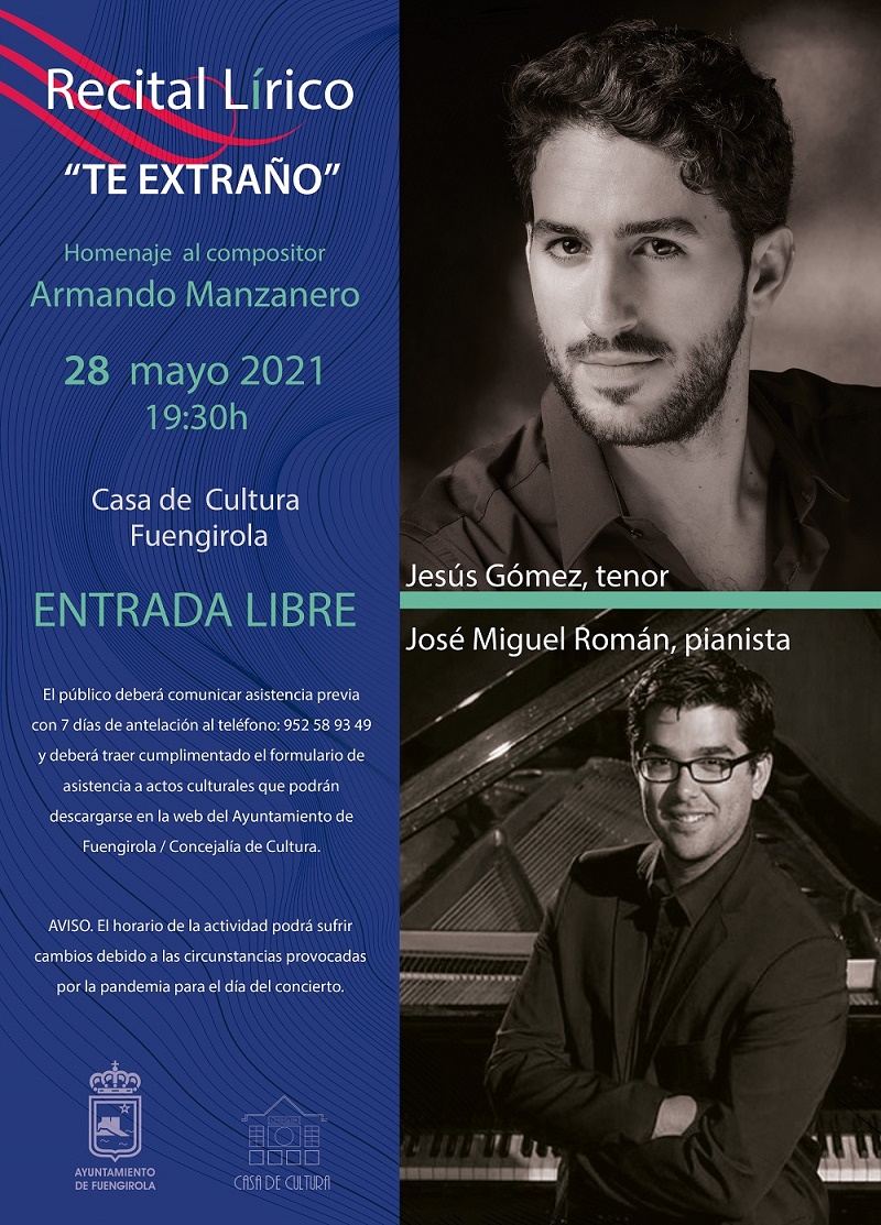 El tenor fuengiroleño, Jesús Gómez, y el pianista José Miguel Román actuarán el 28 de mayo, a partir de las 19:30 horas, con entrada gratuita. Los interesados deberán comunicar su asistencia previa llamando al teléfono 952 58 93 49 y entregar un formulario cumplimentado disponible en la web www.fuengirola.org