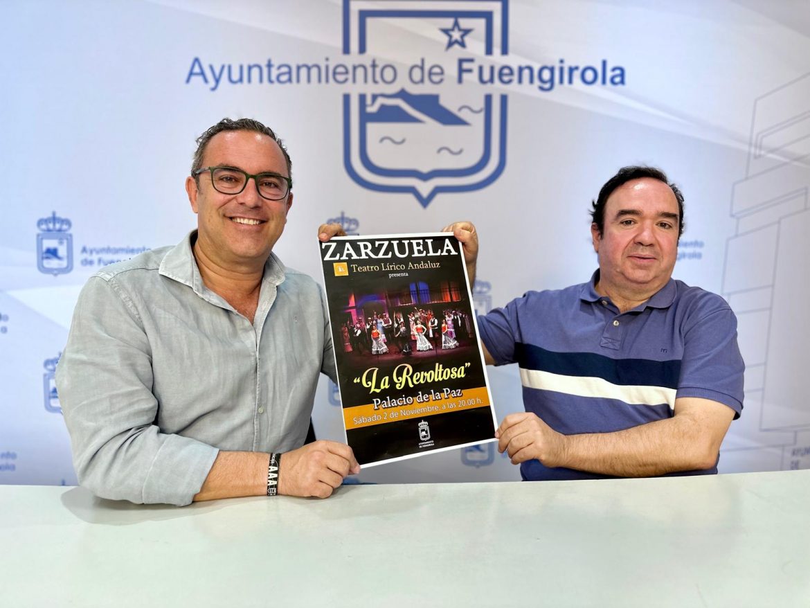 La zarzuela regresará al Palacio de la Paz el sábado 2 de noviembre, a partir de las 20:00 horas, de la mano de la compañía Teatro Lírico Andaluz, que representará la obra ‘La Revoltosa’. Así lo ha anunciado el concejal de Cultura del Ayuntamiento de Fuengirola, Rodrigo Romero, acompañado por el director de Teatro Lírico Andaluz, Pablo Prados, quienes han explicado que las entradas para la función tienen un precio de 10 euros el patio de butacas y de 15 euros los palcos y se pueden adquirir en la web https://entradas.fuengirola.es o en la taquilla del Palacio de la Paz desde dos horas antes del comienzo de la función.