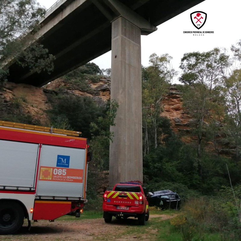 Efectivos del Consorcio Provincial de Bomberos de Ronda han actuado en el accidente de tráfico producido en la A-367 del municipio tras precipitarse un vehículo por el puente de La Ventilla.