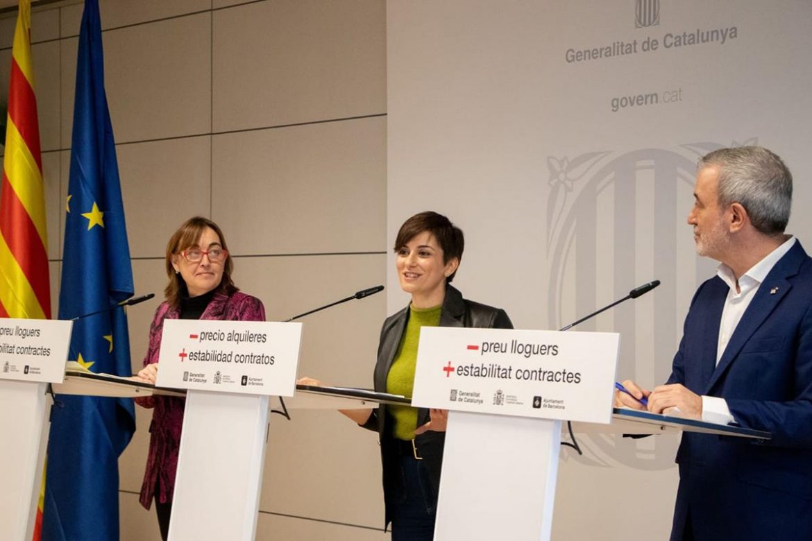 La titular de Vivienda y Agenda Urbana, Isabel Rodríguez, la consellera de Territori, Habitatge i Transició Ecològica del Govern de la Generalitat de Catalunya, Sílvia Paneque, y el alcalde de Barcelona, Jaume Collboni, han comparecido en Barcelona para presentar el balance de la aplicación en Catalunya de las primeras zonas de mercado tensionado, recogidas en la Ley por el Derecho a la Vivienda, con motivo del primer aniversario de su entrada en vigor.