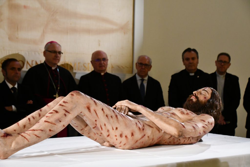 Llegado el momento de más emoción, las autoridades y los miembros del Consejo de Gobierno y del Cabildo han pasado a la sala que alberga la imagen hiperrealista del hombre de la Sábana Santa. De manera ceremoniosa, han levantado el lienzo que cubría el cuerpo, para después tener un momento de profundidad ante el misterio de la Encarnación: Dios mismo, entra a formar parte de la historia de la humanidad, para muriendo y resucitando, devolvernos la dignidad de hijos de Dios.
