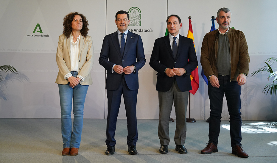 El presidente andaluz ha presidido en el Palacio de San Telmo la Mesa de Diálogo Social integrada por la secretaria general de CCOO Andalucía, Nuria López, el secretario general de UGT Andalucía, Oskar Martín, y el presidente de la CEA, Javier González de Lara, para abordar el tema de los aranceles y su repercusión en Andalucía.