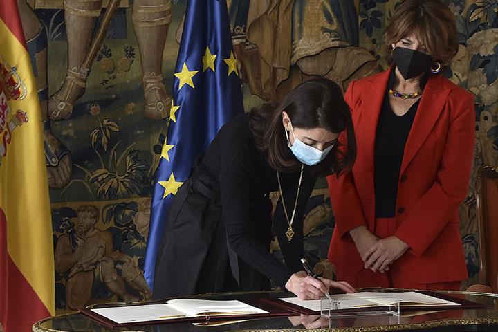 La ministra de Justicia, Pilar Llop, y la fiscal general del Estado, Dolores Delgado, han firmado este convenio, que supone un avance en derechos de la carrera fiscal. Según Llop, es un «ejemplo palpable de la cogobernanza entre instituciones»