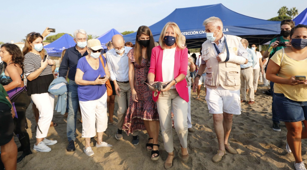 La alcaldesa, Ángeles Muñoz, ha participado en la suelta de 39 tortugas bobas por parte de la Junta de Andalucía en la playa de Cabopino, lugar en el que nacieron el pasado año. La regidora ha subrayado la “gran labor” de los voluntarios y asociaciones como Produnas que han colaborado en su cuidado desde el inicio, con la custodia del nido localizado en agosto de 2020 en Fuengirola y trasladado posteriormente a Marbella. Estos ejemplares han permanecido durante más de un año al cuidado del Centro de Gestión del Medio Marino (Cegma) del Estrecho y del Acuario de Sevilla hasta alcanzar el tamaño adecuado para su regreso al mar. “Se encuentran con un peso de entre medio kilo y uno, que es ya el considerable para que puedan incorporarse a su hábitat natural, por lo que hoy es un día muy esperado e importante”, ha señalado la primera edil.