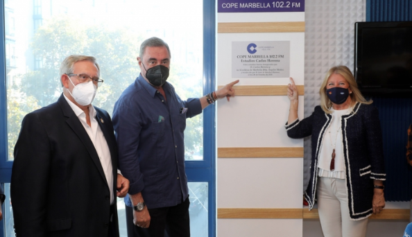 La alcaldesa, Ángeles Muñoz, ha respaldado hoy a Cope Marbella en la inauguración oficial de sus nuevos estudios, desde los cuales el periodista Carlos Herrera ha realizado su programa para toda España. La regidora ha dado su enhorabuena al director de la emisora local, José Antonio Gómez, y a todo su equipo y ha destacado “el gran trabajo y la trayectoria que tienen en Marbella”. La primera edil ha sido la encargada de descubrir, junto con Herrera, la placa inaugural de los estudios, que llevarán el nombre del periodista almeriense.