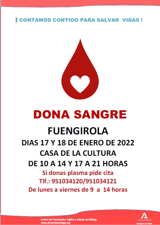 La Casa de la Cultura de Fuengirola acogerá una colecta de sangre y plasma los próximos días 17 y 18 de enero. Esta campaña está promovida por el Centro de Transfusión, Tejidos y Células de Málaga, dependiente de la Consejería de Salud y Familia de la Junta de Andalucía.