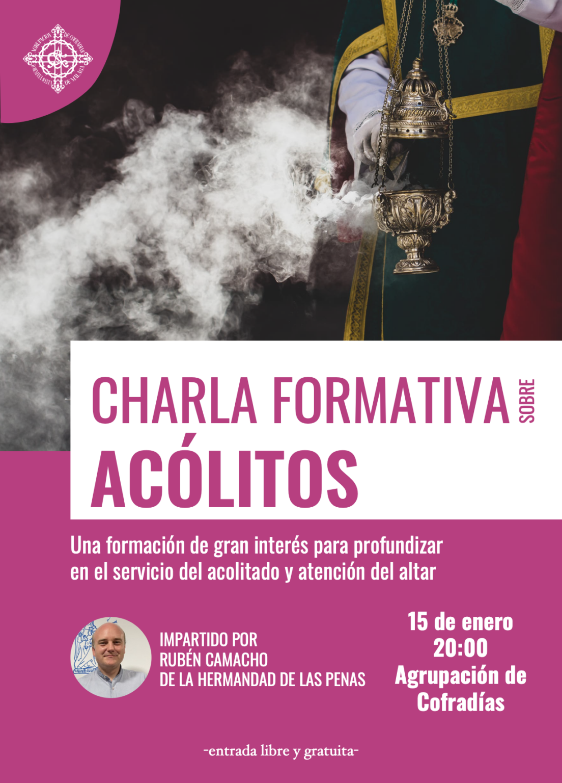 La formación estará impartida por Rubén Camacho Fernández, de la Hermandad de las Penas, quien ofrecerá una visión introductoria y fundamentada bajo el título: “Los acólitos en las hermandades y cofradías”. El contenido abordará qué es un acólito, su servicio en el altar y en las procesiones, la importancia de su papel en las celebraciones litúrgicas, así como su identidad y competencias.