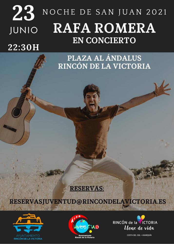 El área de Juventud del Ayuntamiento de Rincón de la Victoria ha organizado para celebrar la Noche de San Juan el concierto en directo de Rafa Romera, tal y como ha avanzando el concejal, Antonio José Martín (PP).