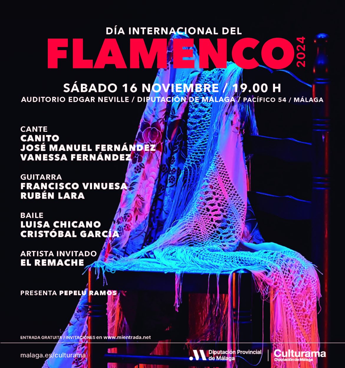 La Diputación de Málaga celebrará este sábado, 16 de noviembre, a las 19.00 horas, el Día Internacional del Flamenco con un espectáculo de cante, baile y guitarra protagonizado por artistas malagueños. La cita será en el auditorio Edgar Neville (calle Pacífico, 54), con entrada gratuita previa reserva de invitaciones en la página web www.mientrada.net.