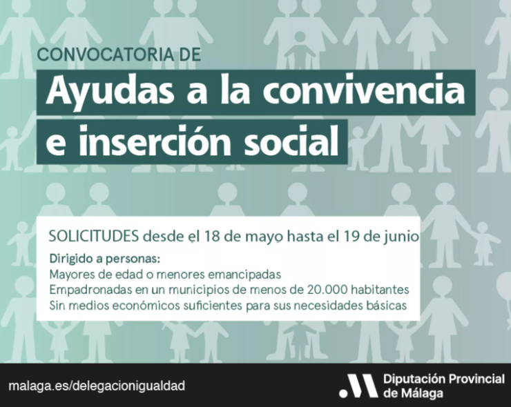 La Diputación de Málaga ha abierto el plazo para la concesión de ayudas económicas de apoyo a la convivencia e inserción social para familias, dotadas con 850.000 euros. Hasta el 19 de junio podrán solicitar estas ayudas personas mayores de edad o menores emancipadas que residan y estén empadronadas en municipios menores de 20.000 habitantes de la provincia y que carezcan de medios económicos suficientes para atender sus necesidades básicas. Las solicitudes que se presenten serán valoradas por el personal técnico de los Servicios Sociales Comunitarios.