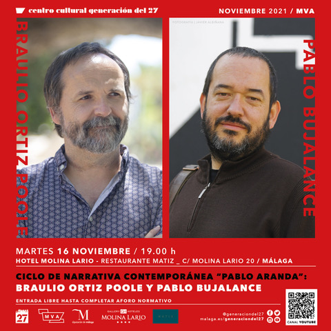El Centro del 27 de la Diputación de Málaga celebra hoy la primera cita de su nuevo ciclo de narrativa contemporánea ‘Pablo Aranda’ con un encuentro entre los escritores y periodistas Pablo Bujalance y Braulio Ortiz Poole en el Hotel Molina Lario. Será a las 19.00 horas, con entrada libre hasta completar aforo.