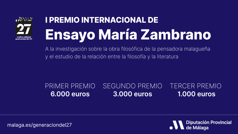 La Diputación de Málaga ha aprobado la convocatoria del I Premio Internacional de Ensayo María Zambrano para alentar la investigación sobre la obra filosófica de la pensadora malagueña, en particular, y el estudio de la relación entre la filosofía y la literatura, en general. Habrá tres primeros premios, dotados con 6.000, 3.000 y 1.000 euros, respectivamente, y la obra premiada en primer lugar será editada por el Centro de Ediciones de la Diputación Provincial de Málaga.