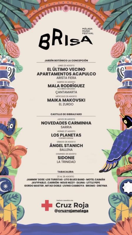 Tres serán los escenarios de la ciudad que acojan los conciertos del 23 al 29 de agosto: el Jardín Botánico de la Concepción, el Castillo de Gibralfaro y Tabacalera. Los beneficios de la venta entradas irán destinados íntegramente a Cruz Roja. El ‘Brisa en los distritos’ será la antesala de este festival que recorrerá los barrios de la capital de la mano de bandas malagueñas del 12 al 22 de agosto.