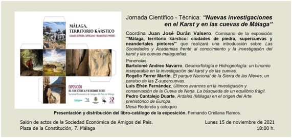 Este año 2021 ha sido declarado por la UNESCO Año Internacional de las Cuevas y del Karst a propuesta de la Unión Internacional de Espeleología y con el apoyo de medio centenar de organizaciones nacionales e internacionales. Con tal motivo, la Sociedad Económica de Amigos del País, la Academia Malagueña de Ciencias, el Instituto Geológico Minero de España y la Diputación Provincial acordaron organizar una exposición para difundir el patrimonio geológico y arqueológico-cultural de la provincia. La muestra, que se puede visitar hasta el 9 de diciembre, ahora se completa con la presentación del libro y la jornada científica de hoy lunes.