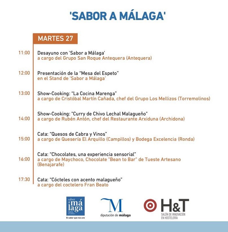 Sabor a Málaga, presente en el Salón H&T desde el año 2013, cuenta con un stand propio de 250 metros cuadrados, el espacio expositivo más grande de toda la muestra. Situado, además, en un lugar preferente dentro de la zona gastronómica, cuenta con la presencia de veinticuatro empresas de la provincia que exponen los mejores productos de la despensa malagueña.