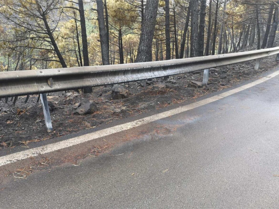 Precisamente, los sistemas de contención fueron uno de los elementos más afectados por el incendio, dado que al tratarse de carreteras de montaña con importantes desniveles están presentes en la totalidad del trazado en al menos una de sus márgenes. La incidencia directa del fuego sobre las barreras de seguridad y las altas temperaturas a las que estuvieron sometidas ocasionaron, por un lado, la pérdida de la protección anticorrosiva (galvanizado) y, por otro lado, la dilatación en exceso de la mismas, que al ser un elemento continuo, atornillado, ha cedido en algunos puntos, llegando a movilizar los postes de anclaje al terreno y provocando curvaturas en el perfil de la barrera, disminuyendo el nivel de contención.