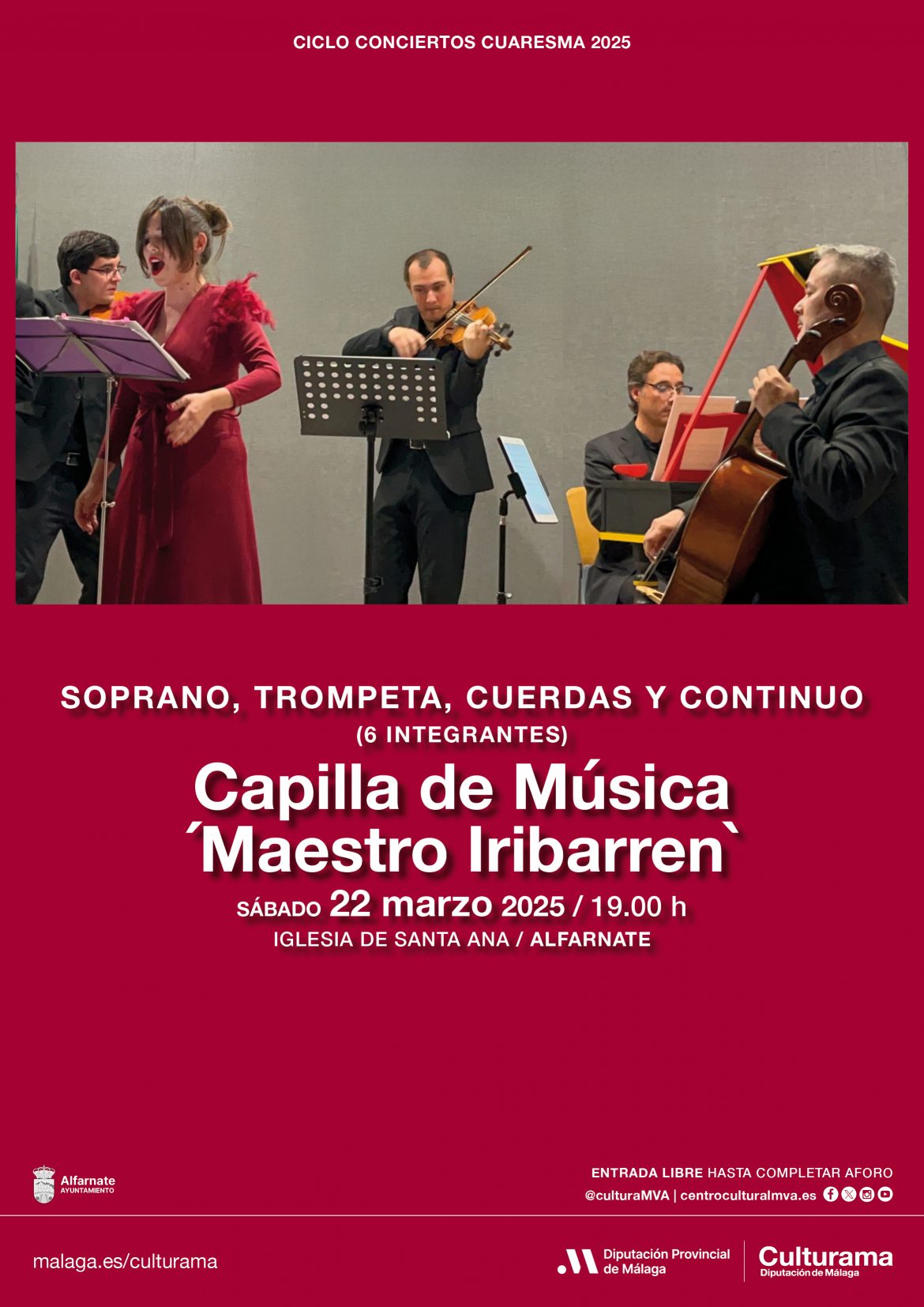 La Capilla de Música Maestro Iribarren estará el 15 de marzo en la Iglesia de Nuestra Señora de la Encarnación de Cútar, el 22 de marzo en la Iglesia de Santa Ana de Alfarnate, y el 16 de abril en la Iglesia Nuestra Señora de la Expectación de Canillas de Albaida Manuel López Mestanza ha recordado que la Diputación organiza este ciclo para dar a conocer la música sacra de distintas épocas con un programa que incluye obras de los siglos XVIII al XX