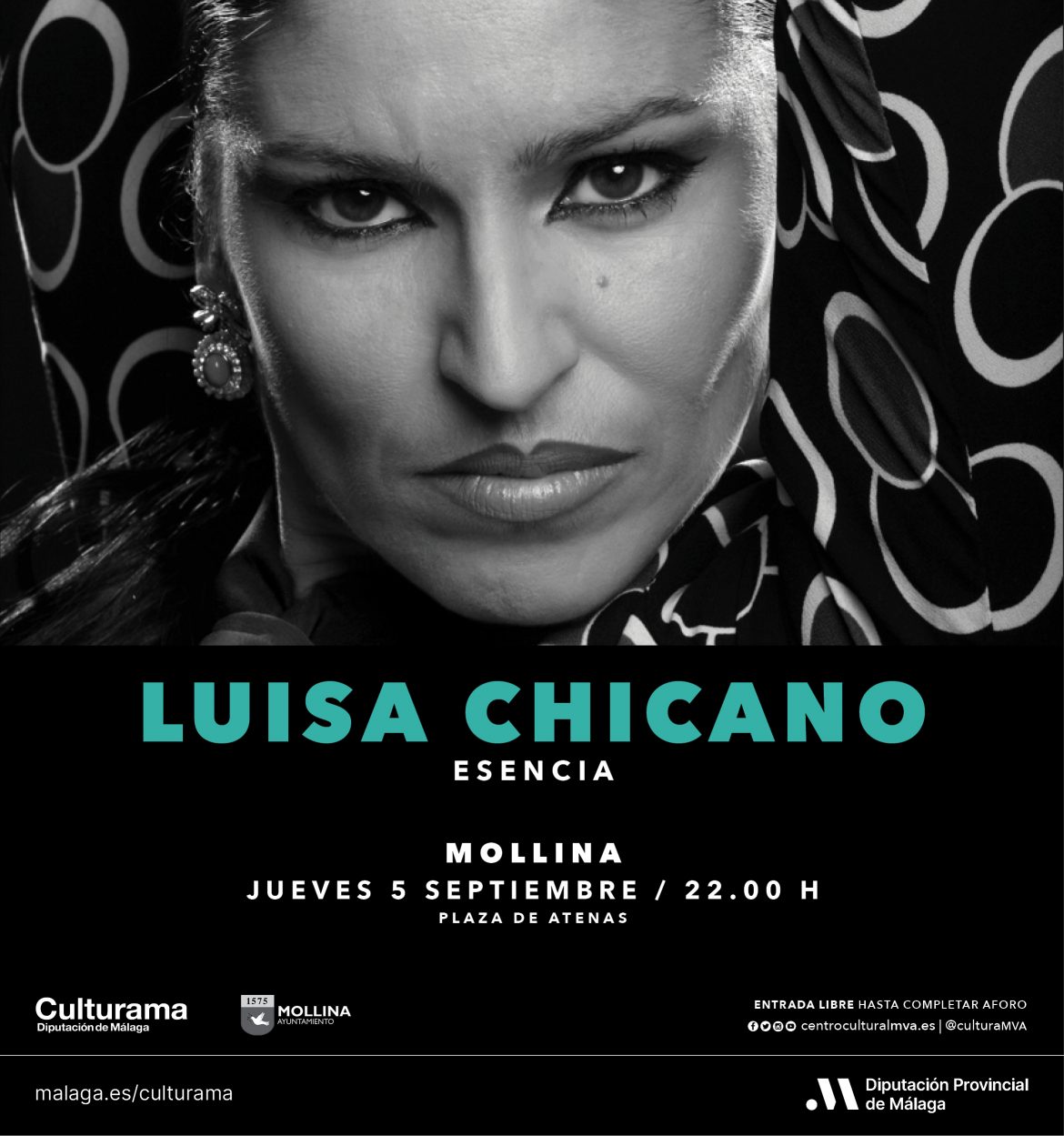 El jueves 5 de septiembre, Luisa Chicano llevará su espectáculo flamenco ‘Esencia’ a Mollina. Actuará acompañada por tres cantaores y un guitarrista en la Plaza de Atenas, a partir de las 22.00 horas, la entrada es libre hasta completar aforo. Luisa Chicano es una profesional del baile flamenco que atesora raza, tradición e intensidad en sus actuaciones y ha mostrado su arte por España, Europa o Japón, entre otros destinos.