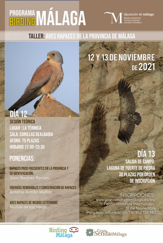 El primer taller se celebrará el viernes 12 de noviembre en la sala Canillas de Albaida del centro cultural La Térmica (Avenida de los Guindos, 48), en horario de 17.30 a 20.30 horas, y podrán asistir un máximo de 75 participantes. La jornada contempla tres ponencias: Juan Ramírez Román hablará sobre rapaces poco frecuentes en la provincia y su identificación; la segunda charla será impartida por Antonio Román Muñoz y versará sobre energías renovables y conservación de rapaces; y la tercera estará a cargo de Matías de las Heras y abordará las aves rapaces de medios esteparios.