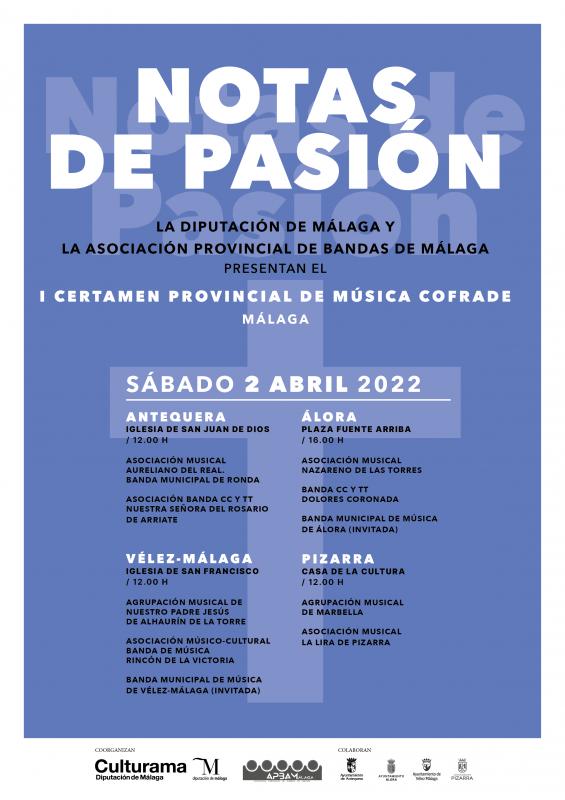 El próximo sábado, 2 de abril, se celebrará el I Certamen Provincial de Música Cofrade ‘Notas de Pasión’. Un encuentro, organizado por la Diputación de Málaga y la Asociación Provincial de Bandas de Málaga (APBAM), que cuenta con la colaboración de los ayuntamientos de Álora, Antequera, Pizarra y Vélez-Málaga.