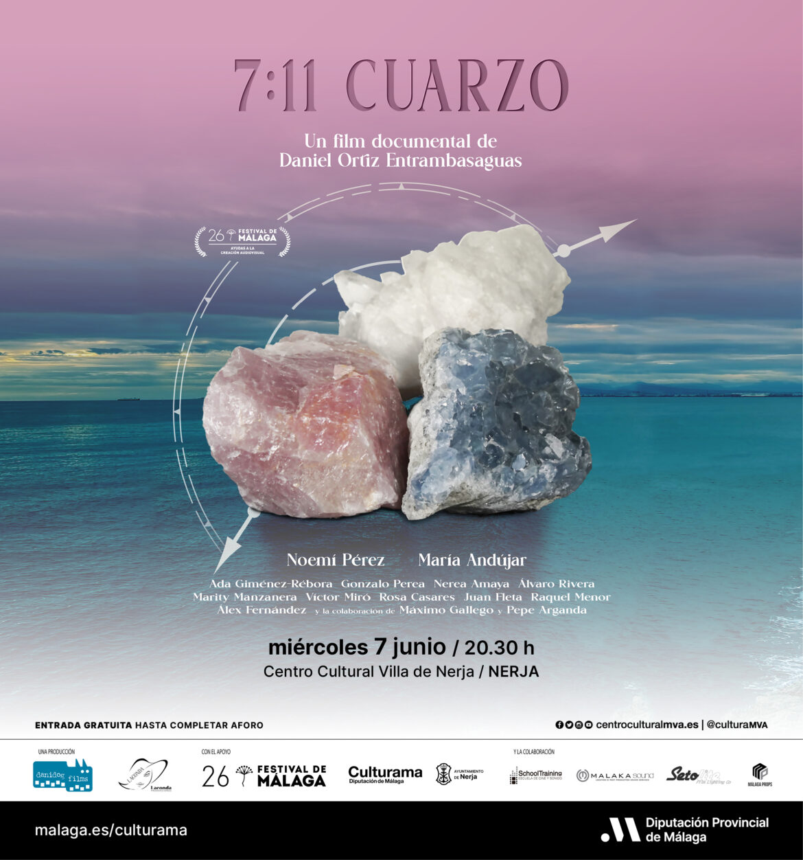 La Diputación de Málaga llevará en el mes de junio el cortometraje documental ‘7:11 Cuarzo’ del cineasta Daniel Ortiz Entrambasaguas a distintos municipios de la provincia, donde los asistentes podrán participar en un coloquio con el autor tras su proyección. Tras su visionado en el centro cultural MVA de la institución provincial el pasado 26 de abril ahora da el salto a la provincia, concretamente a Nerja, Alhaurín de la Torre, Benalmádena y Torremolinos. Hasta el mes de septiembre recorrerá un total de 16 municipios.