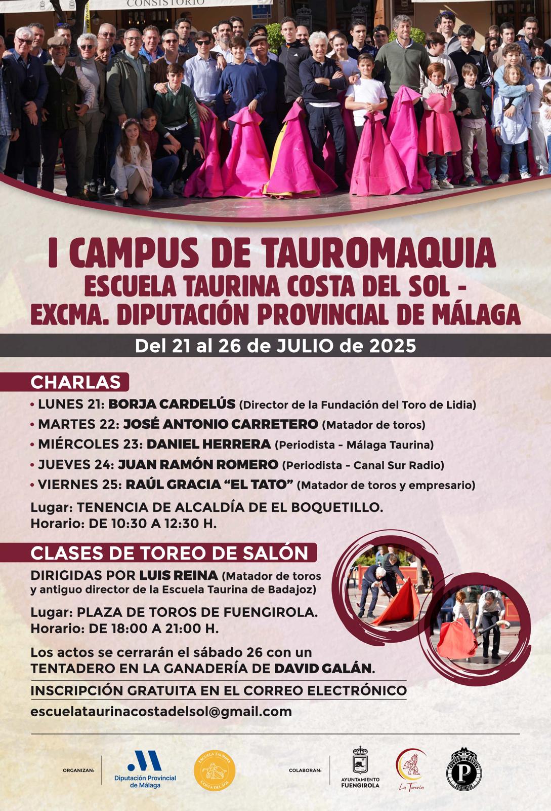 La parte práctica la impartirá el matador de toros Luis Reina, con un toreo de salón de 18 a 21 horas en la plaza de toros de Fuengirola. El campus se cerrará con un tentadero a cargo del torero fuengiroleño David Galán en su propia ganadería.
