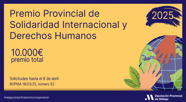 La Diputación Provincial de Málaga ha publicado en el Boletín Oficial de la Provincia la convocatoria 2025 del Premio Provincial de Solidaridad Internacional y Derechos Humanos, dotado con 10.000 euros, con el fin de distinguir y reconocer a aquellas personas y organizaciones, relacionadas con la provincia de Málaga, que, a nivel individual o colectivo hayan contribuido de forma relevante a la promoción de la solidaridad internacional y los derechos humanos. Las candidaturas pueden presentarse hasta el día 8 de abril inclusive.
