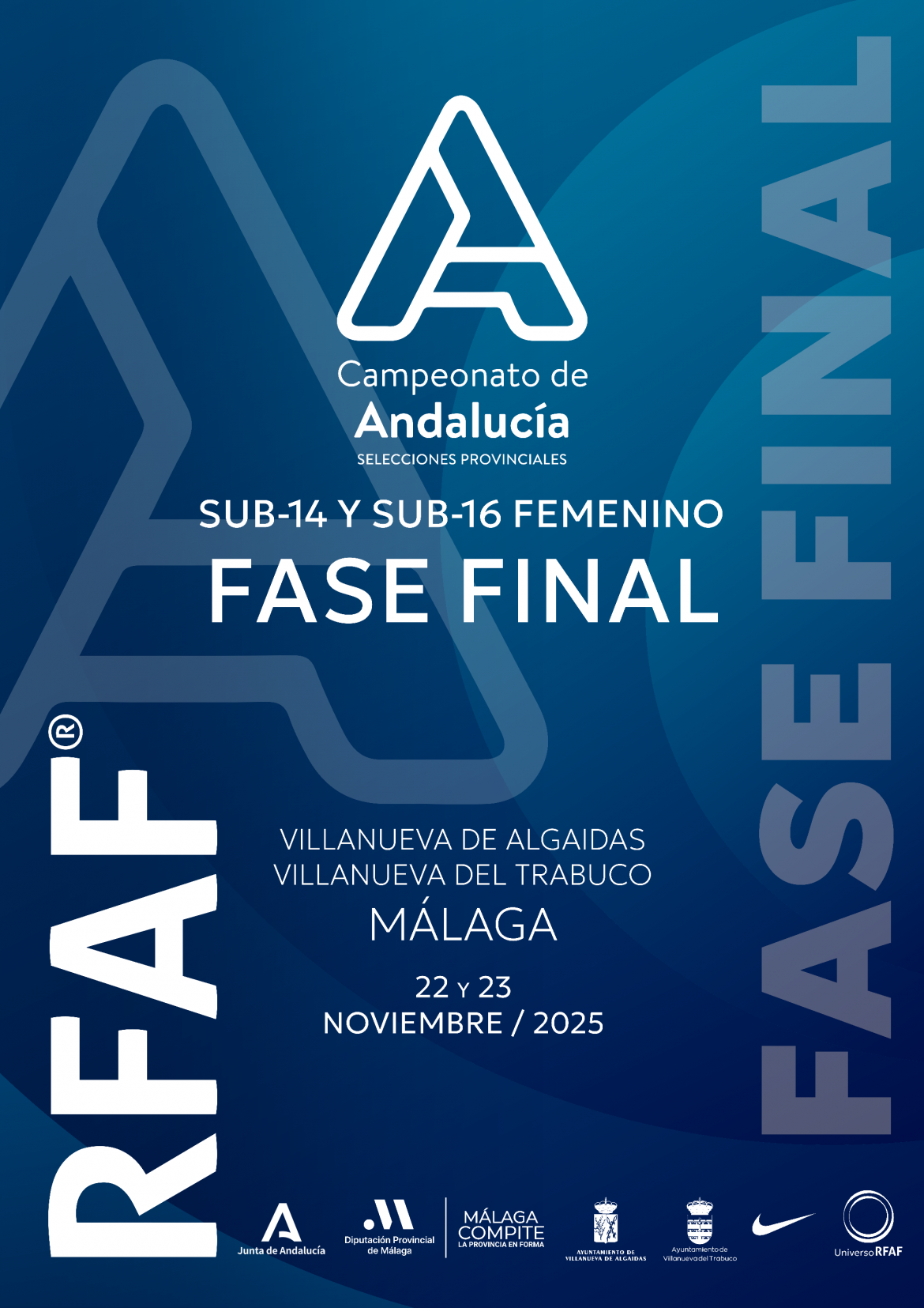 La Diputación de Málaga trae a la provincia la final del Campeonato de Andalucía de Selecciones Femeninas de Fútbol Sub14 y Sub16, el evento de fútbol femenino más importante que organiza la Real Federación Andaluza de Fútbol en el transcurso de la temporada. Más de 150 jugadoras de las selecciones provinciales de Málaga, Almería, Córdoba, Jaén y Sevilla se enfrentarán por el título los días 22 y 23 de noviembre en Villanueva de Algaidas y Villanueva del Trabuco.