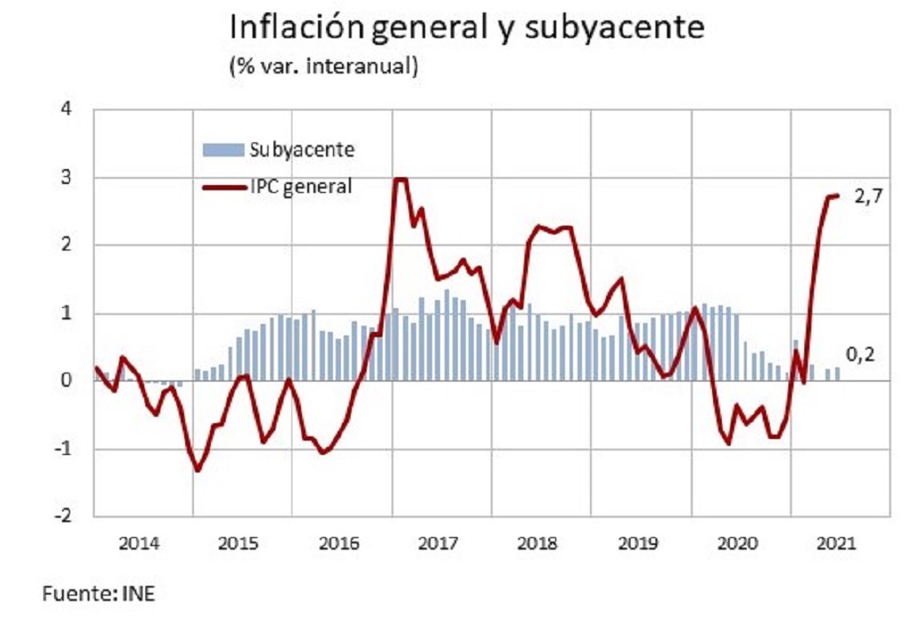 - La subida interanual del IPC se mantuvo en junio en el 2,7%, como en mayo, tasas influidas por los efectos base provocados por la caída de los precios del petróleo en marzo y abril de 2020