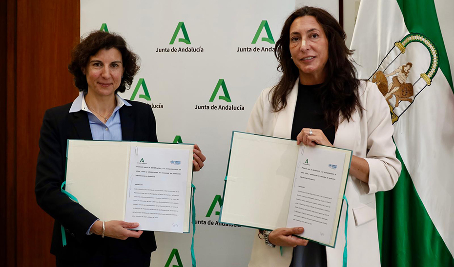 La consejera de Inclusión Social, Juventud, Familias e Igualdad, Loles López, y la representante en España de la Agencia de la ONU para los Refugiados (ACNUR), Sophie Muller, han firmado un protocolo para la identificación y el acompañamiento de niños, niñas y adolescentes no acompañados con necesidad de protección internacional en Andalucía.